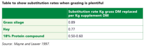 When high-quality grass is readily available, research has shown supplementary or buffer feeding will directly substitute grazing, therefore reducing grass intake. In general, forage has a high substitution rate, resulting in poor milk yield response if high-quality grass is replaced. The reduction in grass intake when silage is offered has shown to be almost 0.9kg DM for every 1.0kg DM fed. Although concentrates will also displace grazed grass, they do at a lesser rate. When a compound is fed, an increase of around 30-50% in daily DM intake can be observed. Concentrate supplements can improve milk protein content and give a yield response in higher-yielding cows.